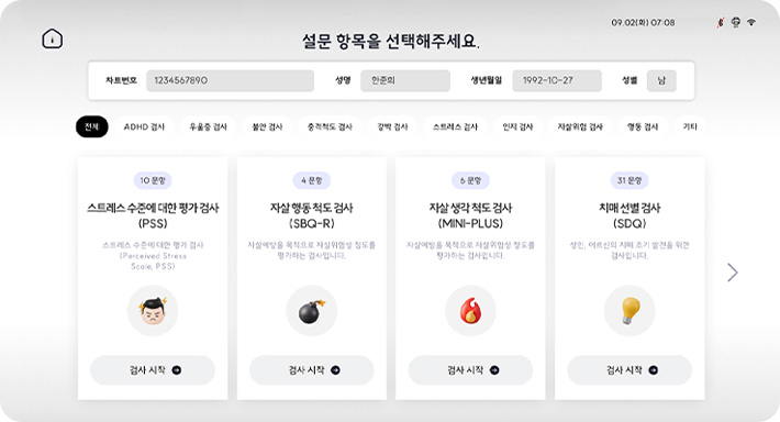 | 스트레스검사 1종 | 인지검사 2종 | 자살위험검사 2종 | 행동검사 3종 | 만족도검사 1종 |
