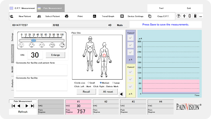 통증의 크기를 정량적 객관적으로 수치화 합니다.