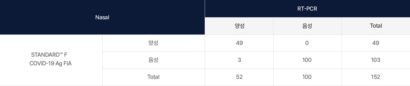- 임상적 민감도 (Ct<30) : 94.23% (49/52), (95% CI: 94.05%-98.79%)